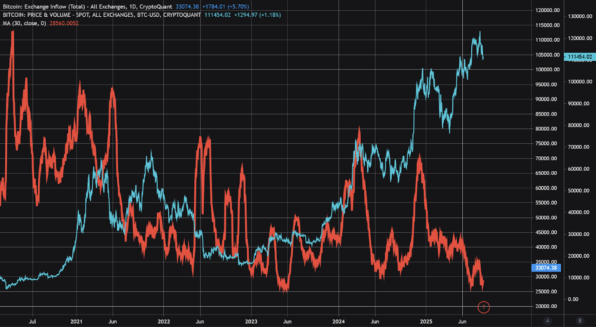 Bitcoin’s price is on the rise again. It dropped to $108,600 on Tuesday, but it quickly, but briefly, rebounded above $112,000. Selling pressure briefly increased, causing a spike in exchange inflows. Now, those inflows are falling again.