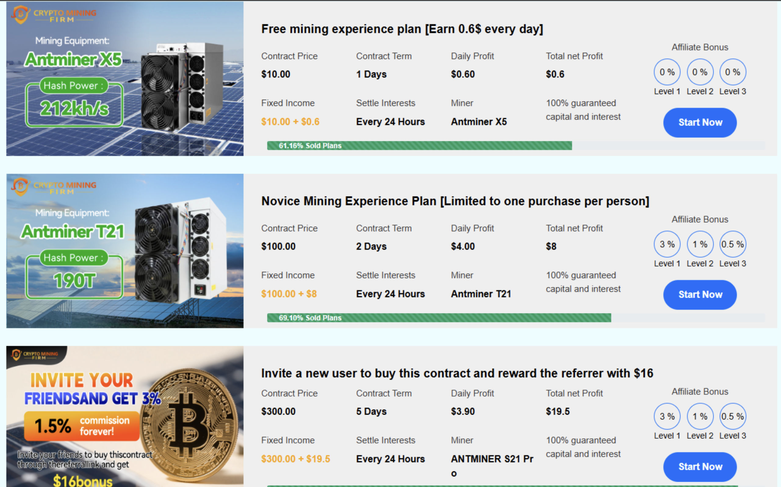Users can start with a small initial investment and choose from a range of contracts with fixedterms and yield structures. According to the platform, the returns vary by plan and are creditedto the user’s account daily. Withdrawals are available after reaching a set threshold.