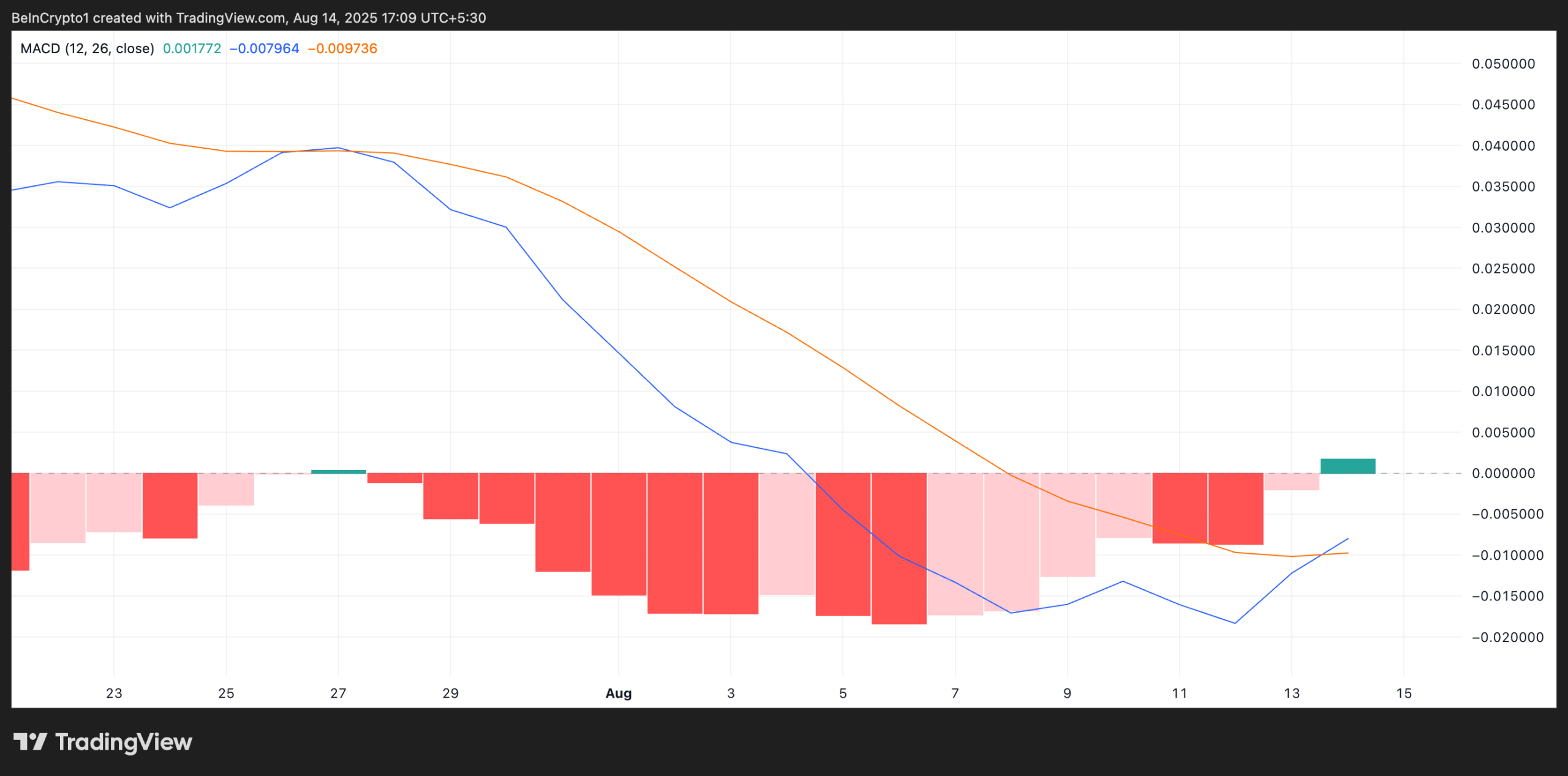 Readings from the USELESS/USD one-day chart show the token’s MACD line (blue) sitting on top of its signal line (orange) for the first time since July 17.